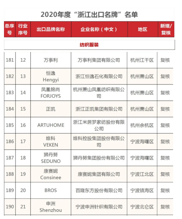 日前,浙江省商務廳公布了2020年度“浙江出口名牌”名單,維科集團“維科VEKEN”通過復核,再獲“浙江出口名牌”稱號,有效期為三年(2021--2023年)。加上之前評定的尚在有效期內(nèi)的興洋KōYō、天雪TISNOW品牌(有效期2019--2021年),集團目前已有三個“浙江出口名牌”。