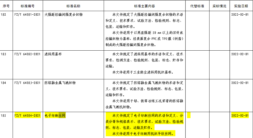近日,由維科絲網(wǎng)牽頭,中國產(chǎn)業(yè)用紡織品產(chǎn)業(yè)協(xié)會(huì)和浙江紡織服裝職業(yè)技術(shù)學(xué)院共同參與起草的"FZ/T 64084-2021--電子印刷絲網(wǎng)"行業(yè)標(biāo)準(zhǔn)已正式獲批頒布。絲網(wǎng)行標(biāo)起草申報(bào)工作歷經(jīng)數(shù)年自此塵埃落定!