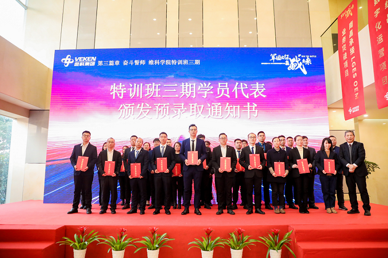 董事長(zhǎng)秘書賁愛建針對(duì)特訓(xùn)班三期項(xiàng)目規(guī)劃及開題要求進(jìn)行介紹,畢優(yōu)曉作為三期班學(xué)員代表進(jìn)行發(fā)言,表達(dá)“同學(xué)習(xí),共實(shí)戰(zhàn),贏勝果”的決心,學(xué)員代表上臺(tái)由維科學(xué)院院長(zhǎng)頒發(fā)預(yù)錄取通知書。
