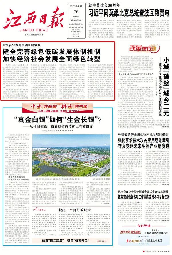 大江網(wǎng)/大江新聞客戶端訊 江西日報(bào)全媒體記者魏星報(bào)道:6月25日,省委書記尹弘深入宜春、南昌,圍繞推進(jìn)綠色低碳發(fā)展體制機(jī)制改革進(jìn)行專題調(diào)研。他強(qiáng)調(diào),要深入貫徹習(xí)近平生態(tài)文明思想,以進(jìn)一步全面深化改革為動力,健全完善綠色低碳發(fā)展體制機(jī)制,提升產(chǎn)業(yè)綠色低碳發(fā)展水平,構(gòu)建碳排放雙控制度體系,加快經(jīng)濟(jì)社會發(fā)展全面綠色轉(zhuǎn)型,讓綠色成為江西高質(zhì)量發(fā)展的鮮明底色。