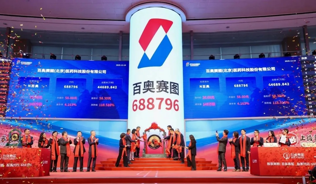 2025年12月10日,百奧賽圖(北京)醫(yī)藥科技股份有限公司在上海證券交易所科創(chuàng)板正式掛牌上市,股票簡稱“百奧賽圖”,證券代碼688796。相比4年前在港交所的亮相,這一次,百奧賽圖交出了一份更成熟的答卷。百奧賽圖的首日漲幅一度沖高到161.62%。